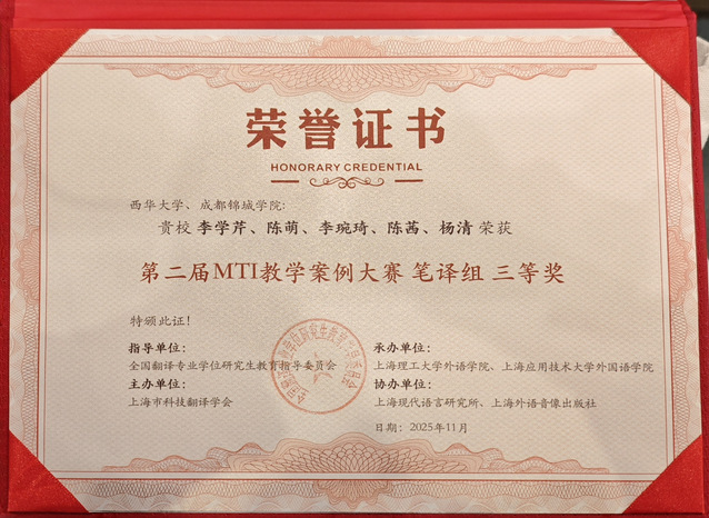 2025年11月1日,2025MTI案例教学研讨会暨“第二届MTI教学案例大赛”颁奖典礼在上海应用技术大学成功举办。经过激烈角逐,我校李学芹老师带领的翻译专业研究生团队凭借案例《“蜀道译途,感官破译行动”——具身认知融入巴蜀文化教学》荣获全国三等奖。本次获奖充分展示了我校外国语学院在专业学位研究生培养、地方文化国际传播与产教融合实践方面的积极探索与成果。