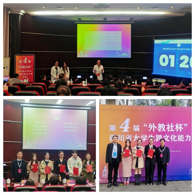 2025年11月2日,由四川省教育厅主办、四川师范大学成龙校区承办的“第四届四川省大学生跨文化能力大赛暨第八届‘外教社杯’全国高校学生跨文化能力大赛四川赛区决赛”落下帷幕。本届赛事汇聚了来自全省各大高校的优秀队伍,竞争激烈。由我校外国语学院英语专业林心悦同学、文学与新闻学院网络与新媒体专业徐子幸同学、法学院法律专业薛雨涵同学组成的跨学科参赛团队,在梁勇、饶斌、李国宏三位老师的联合指导下,凭借优秀的跨文化沟通能力、创新的案例分析能力和稳定的临场发挥,在四川省决赛的十二支参赛队伍中总分位列第五,荣获大赛二等奖。这一成绩充分展示了我校学子优秀的综合素质与国际化视野。