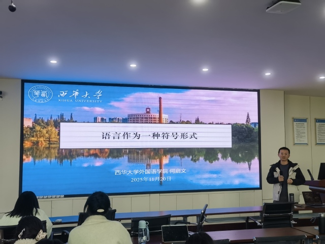 2025年11月20日下午,西华大学外国语学院在4C-504举办了系列高水平研究生学术讲座,分别由西华大学外国语学院教师石兴博士、王洵博士与何启文博士主讲,分别以“文学与历史的对话”、“人类世气候变化批评”以及“语言作为一种符号形式”为主题,展开多元深入的学术分享。本次讲座由西华大学外国语学院教师于云飞主持,学院部分教师、研究生积极参与其中。