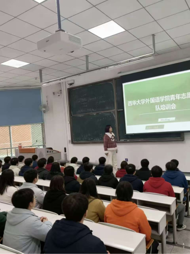 为进一步深化“语言+志愿”特色服务模式,提升志愿者在秋冬季节重点志愿服务场景中的实战能力,2025年10月,西华大学外国语学院青年志愿者服务队(以下简称“青服队”)面向全院志愿者开展专项培训会。百余名志愿者围绕冬季涉外服务保障、应急语言支援、长周期志愿服务心理调适等核心内容展开学习,为四季度志愿服务工作提质增效筑牢基础。