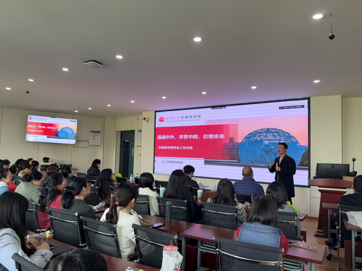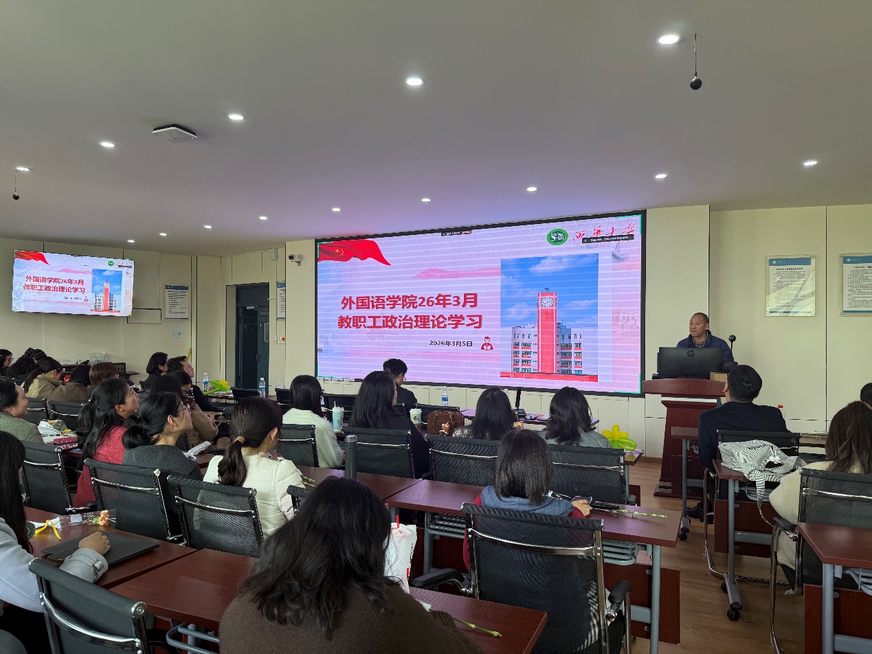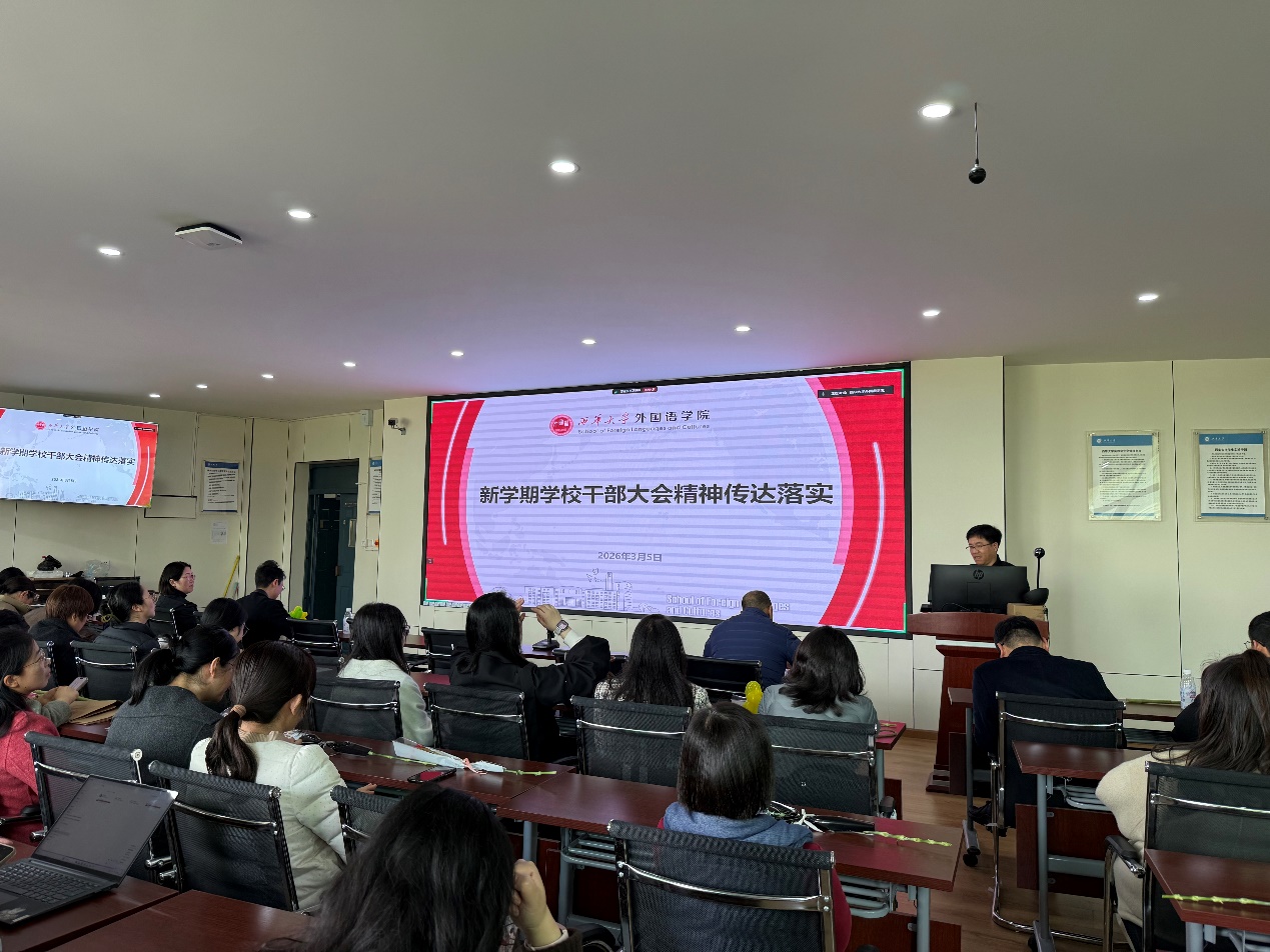 为全面贯彻落实学校新学期工作部署,明确学院发展目标与工作重点,凝聚全院教职工干事创业合力,2026年3月5日,外国语学院新学期第一次全院教职工大会在郫都校区、宜宾校区同步召开。学院全体教职工参会,会议由学院党委书记张彦主持。