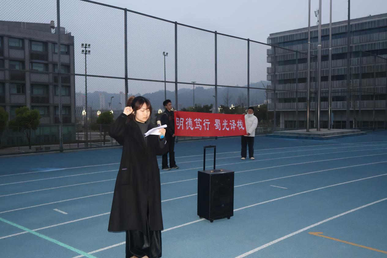 升旗礼毕,翻译2025级4班学生代表周玉发表了主题为《明德笃行,勇担使命》的国旗下演讲。她用真挚的语言呼吁新时代外语学子,以今日为起点,明德、笃行、博学、致远,在“蜀光译栈”搭建的桥梁上,不断锤炼本领、积累经验,用语言架起桥梁,用青春拥抱时代,用奋斗书写无愧于祖国、无愧于时代的壮丽篇章。