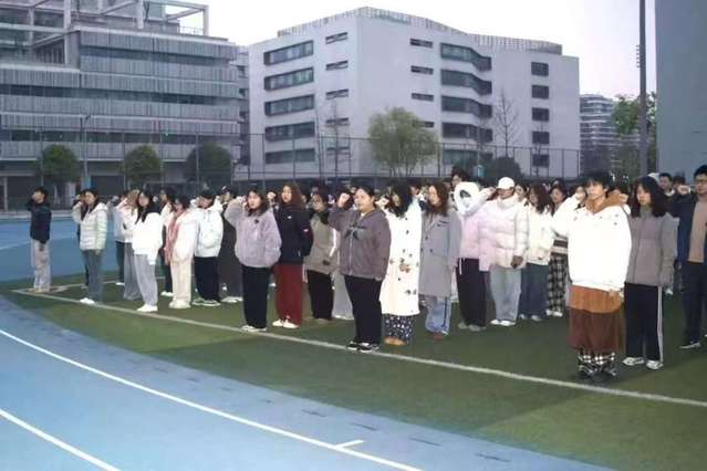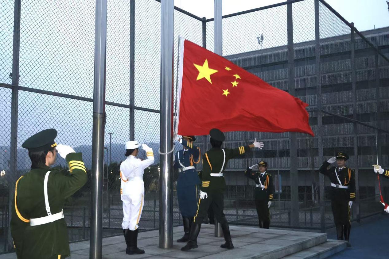 早上7时整,国防特勤中队身姿挺拔、步伐齐整,护送五星红旗至国旗台前。伴随着激昂嘹亮的国歌,升旗手挥臂展旗,鲜艳的五星红旗迎着朝阳冉冉升起。全体师生庄严肃立,目光坚定地凝望国旗,齐声高唱国歌。