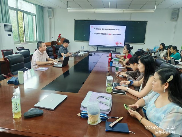 2025年9月11日下午,西华大学外国语学院英语系、翻译系在学院317会议室联合召开新学期教研工作会议,宜宾校区教师通过线上方式同步参会。学院副院长叶林果出席会议并作工作指导。会议聚焦政治理论学习、新进教师交流、教学工作部署、国家社科项目申报经验分享四大核心议题,开展了深入研讨和交流。