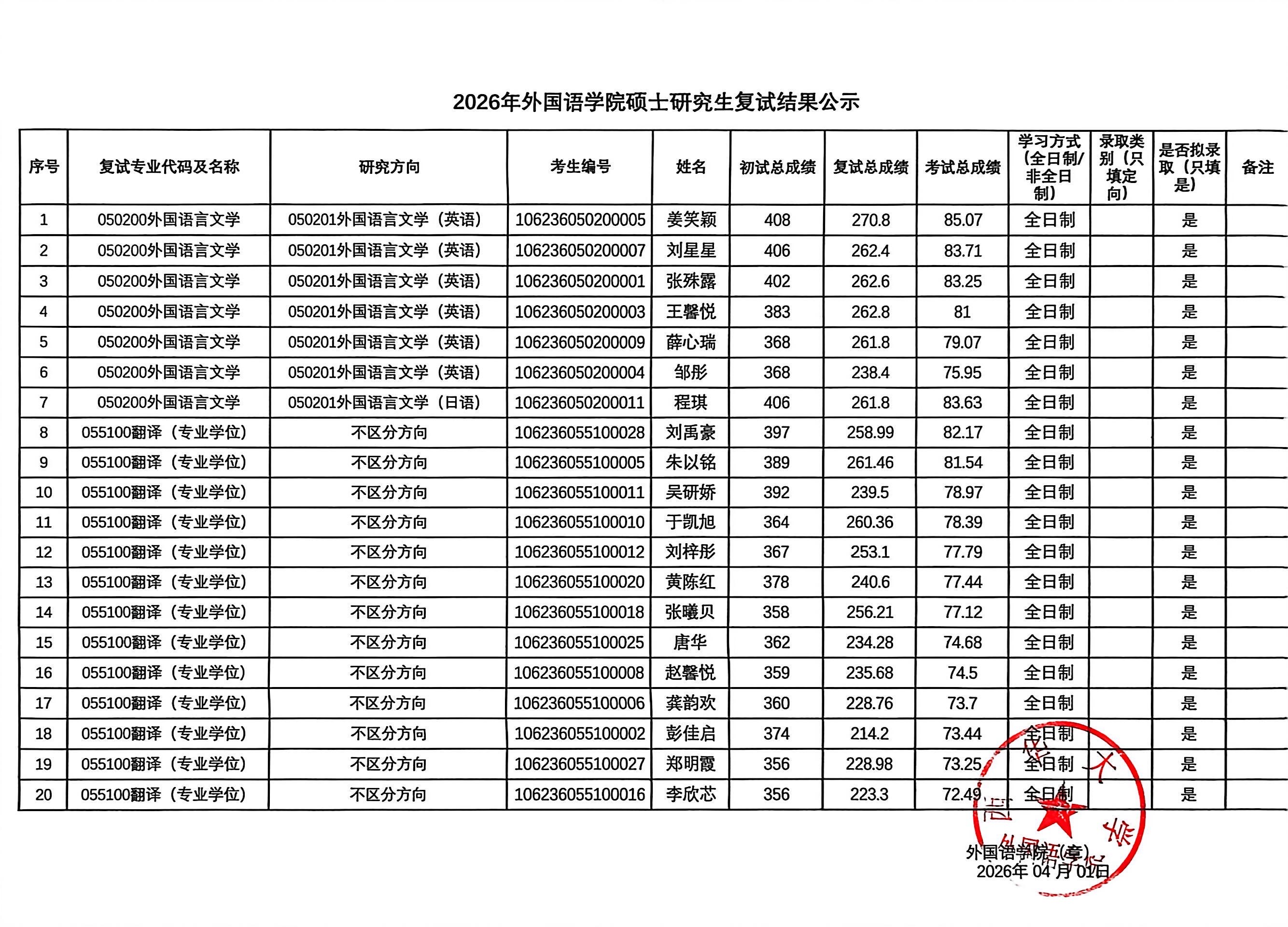 西华大学外国语学院2026年硕士研究生复试结果公示