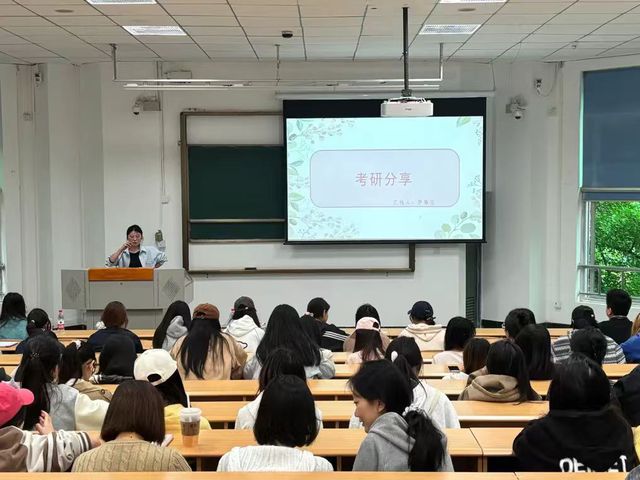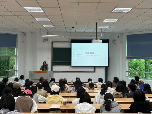 在经验分享环节,2022级日语专业尹春兰学姐、2022级英语专业王馨悦学姐先后上台,结合自身的考研准备过程,从资料收集、时间安排、科目复习、心态调整等多个方面进行了细致讲解。尹春兰重点分享了日语专业考研以及跨考的复习重点与应试技巧,王馨悦则围绕英语专业方向选择、真题使用技巧等内容展开介绍。两位学姐的分享内容翔实、贴近实际,既有方法指导,也有精神鼓励,在场同学受益匪浅。
